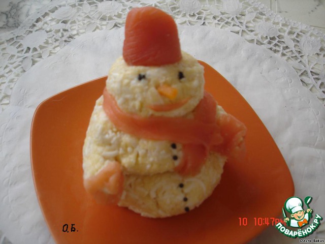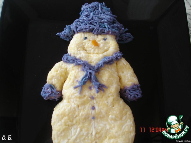 Делаем форму снеговика, украшаем белком, предварительно замоченным в соке красной капусты.