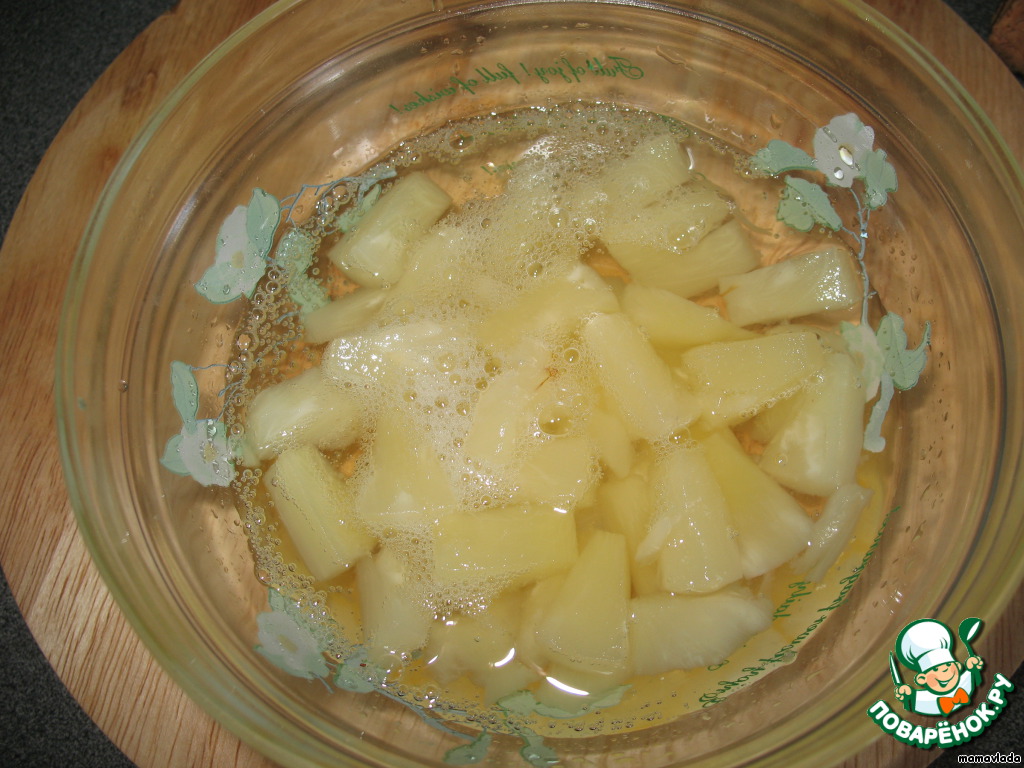 Ананасы выложить в миску без сиропа, залить шампанским. Оставить минут на 30.