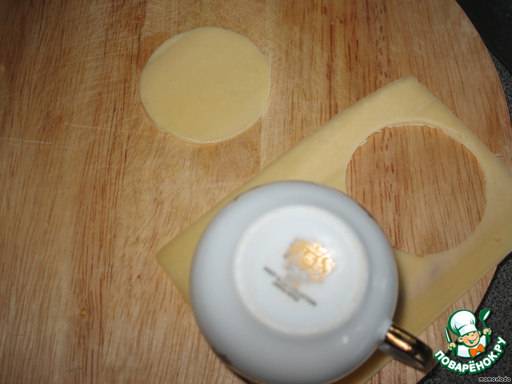 Подходящей по размеру чашечкой (рюмочкой, стаканчиком и пр.) вырезать кружочки из сыра. Я вырезала самой маленькой кофейной чашечкой. Мешочки получились "на один зубок".
