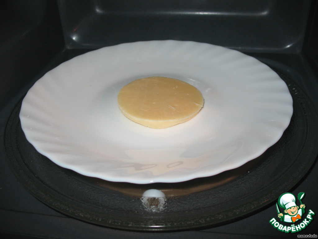Сырные кружочки по одному ставить секунд на 8-10 в микроволновку. Чтоб сыр стал очень мягким, но не расплавился.