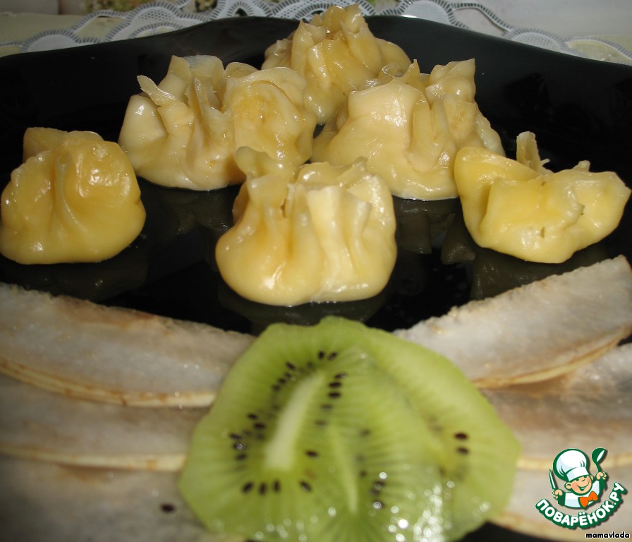 Украсить тарелку грушей и киви, выложить мешочки, налить шампанское и наслаждаться.