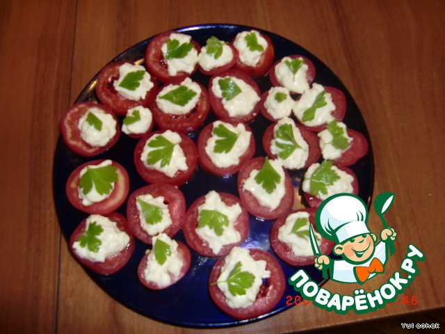 Помидоры нарезать кружочками. Сверху на помидоры выложить полученную массу, украсить зеленью, присыпать черным молотым перцем ( у меня не было, но с ним вкуснее).