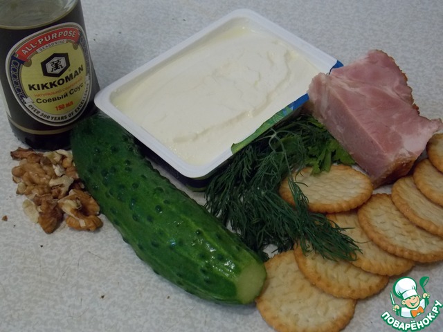 Зелень и ветчину мелко режем. Орехи измельчаем. Все перемешать с сыром. Добавить соус kikkoman. Огурцы режем колесиками.