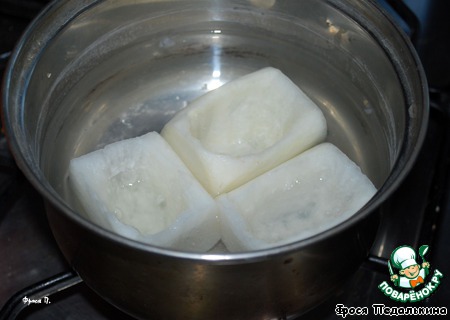 Отварить дайкон в кипящей подсоленой воде пока не станет чуть мягким, примерно 6-8 минут, в зависимости от размера кубиков.