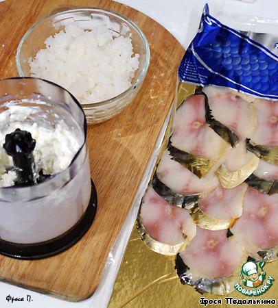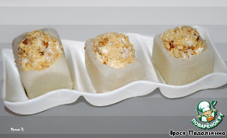 В блендере измельчить 1/3 оставшегося дайкона, сыр адыгейский и грецкие орехи. Скумбрию очистить от костей и кожи, порезать на небольшие кусочки. Начинку придумывала по ходу пьесы, очень удачно получилось.