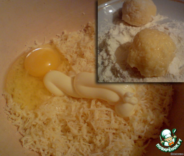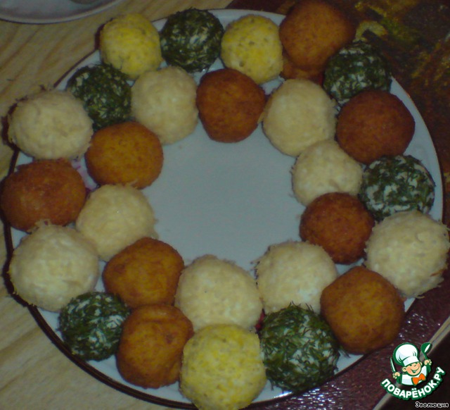 Из сырной массы катаем шарики. Половину из них обваливаем в сырной стружке.