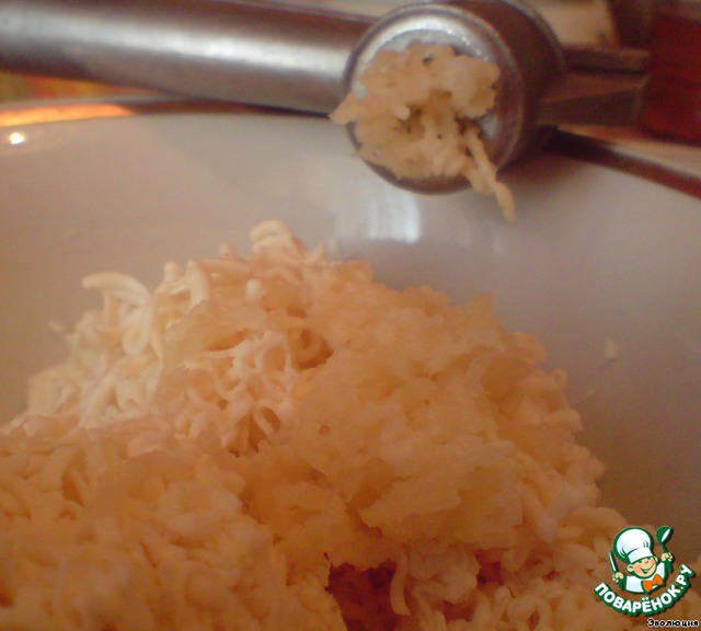 К ним на этой же терке натереть плавленые сырки, добавить майонез и чеснок, пропущенный через пресс. Перемешиваем до однородной массы.
