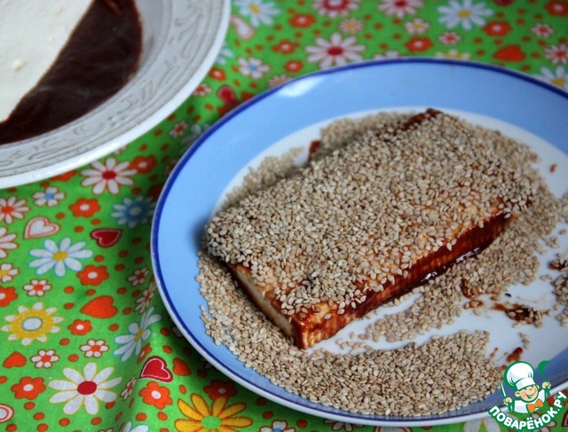 Фету, обильно обмазанную томатно-соевым соусом, запанировать в кунжуте