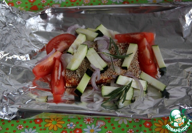 Такой конвертик получается очень сочным: кунжут не только защищает сыр от плавления, но и пропитывается соусом и одновременно становится незаменимой вкусной сочной частью здорового питания! Остальные овощи также не остаются без внимания данного соуса - они тушатся в нём в закрытом состоянии фольги, ароматизируясь розмарином... Очень вкусные, незабываемые ощущения!