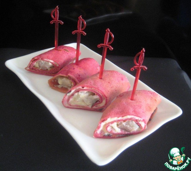 Для подачи на праздничный стол можно зарепить блинные рулетики шпажкой.