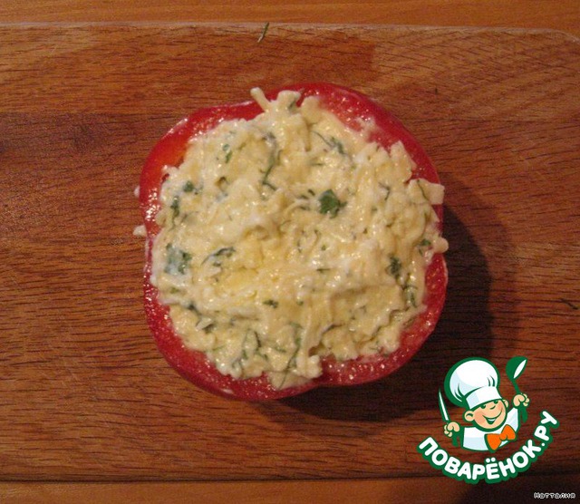 Начинаем фаршировать перец, на дно укладываем немного сырной начинки.