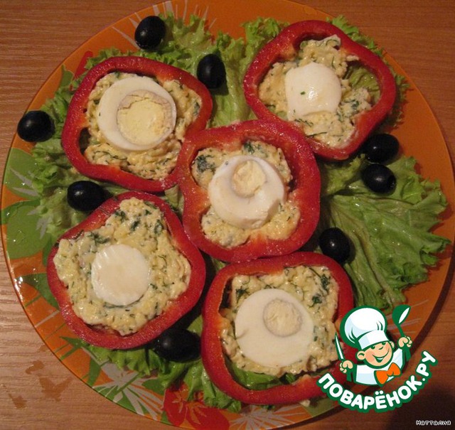 | Вкусная и яркая закуска на праздничный стол. Сладкий перец нежно оттеняет пикантный вкус сыра. Рецепт взят из журнала "Люблю готовить". |