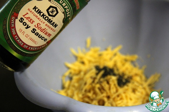 Смешать вместе креветки, яйцо, натертый на терке сыр, семена кунжута и соевый соус.