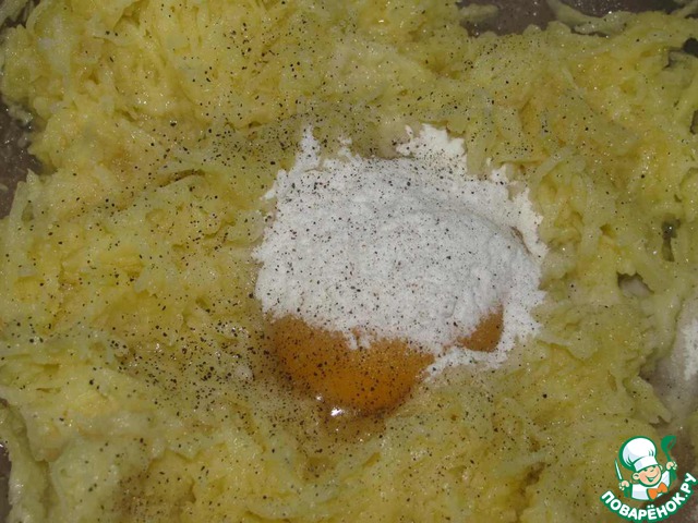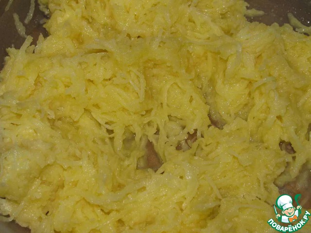 Яблоки и картофель очистить и натереть на мелкой терке и сразу же полить лимонным соком, чтобы масса не потемнела.