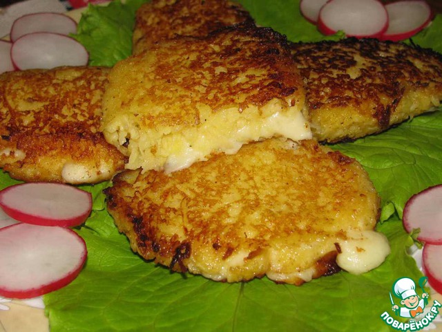 Это удобно делать двумя руками, на одну руку положить немного массы, затем сверху сыр и накрыть его небольшим слоем картофельной массы и двумя руками прижать как котлетку.
