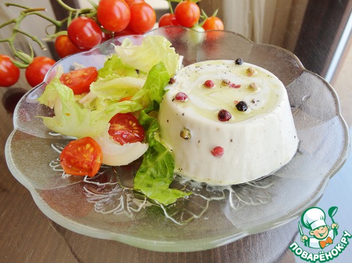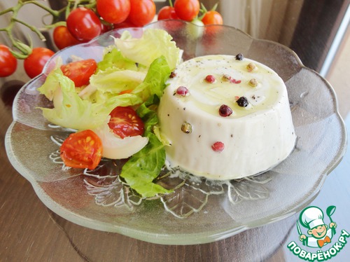 Сервируем эту панна котту с зеленым салатом с помидорами, заправленным смесью оливкового масла, соли и винного уксуса, предварительно слегка полив ее оливковым маслом и посыпав свежемолотым перцем.