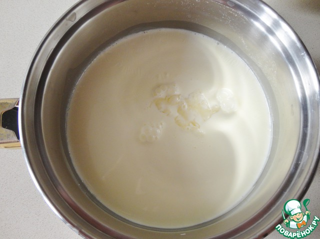В кастрюлю наливаем сливки, молоко и сахар. Перемешиваем.