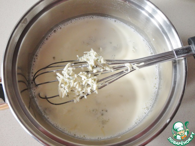 Добавляем натертый сыр и тщательно перемешиваем. Для этого можно использовать ручной блендер, чтобы добиться однородной консистенции.