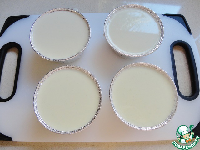 Когда масса станет немного "тяжелой", распределяем ее по формочкам, накрываем пищевой пленкой и ставим в холодильник до полного застывания.
