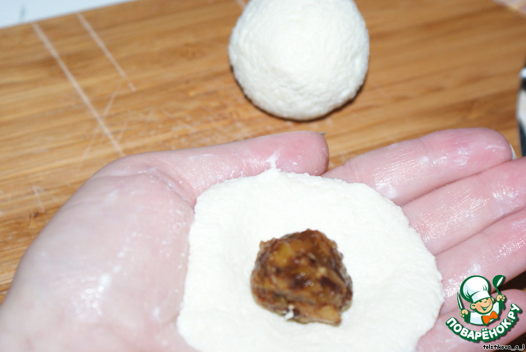 Берем немного сырной массы, расплющиваем и кладем на него начинку, скатать в шарик 2,5-3 см, охладить. Слой сыра не должен быть слишком толстым.
