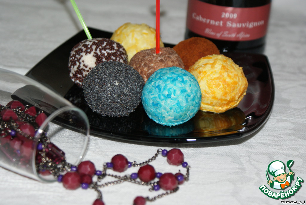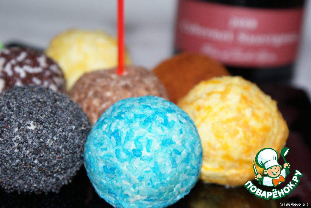Каждый шарик обкатываем в предложенных продуктах. Это может быть обжаренный мак, красная паприка, кокосовая стружка, тертый шоколад, цедра лимона и апельсина.