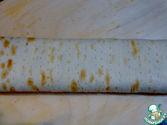 Из лаваша вырезать прямоугольник и смазать его горчицей.