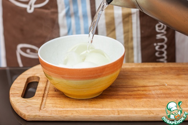 Луковицы очистить, разрезать каждую наполовину и разобрать на лепестки. Серединку луковицы использовать в любых других целях, в ней слишком маленькие лепестки. Сложить луковые чашечки в глубокую миску