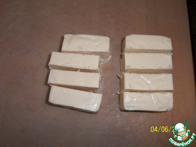 Сырки нарезаем брусочками примерно по 1,5 сантиметра.