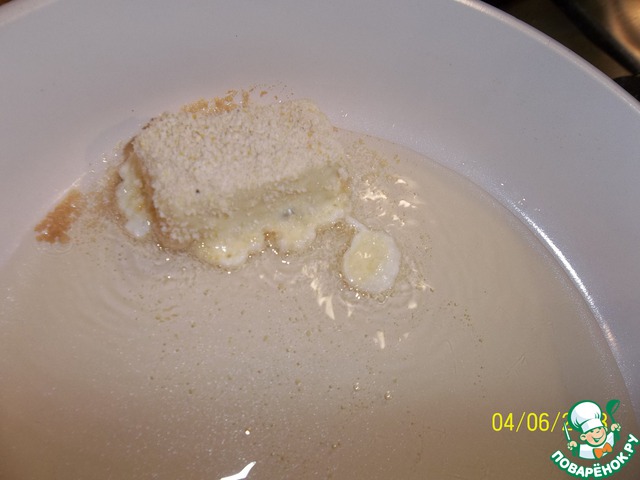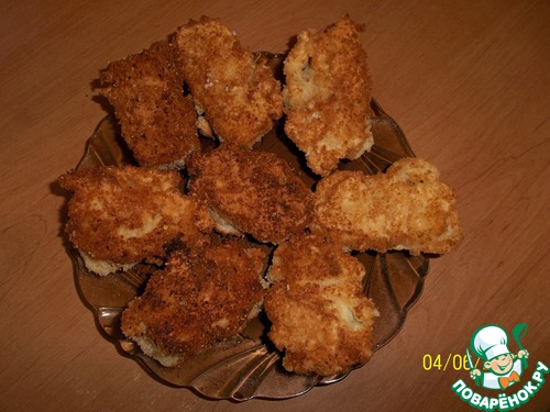 После кляра, брусочек, обваливаем в панировочных сухарях.