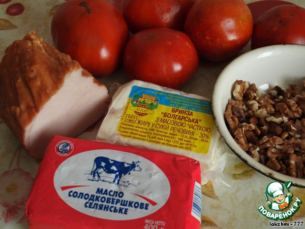 Вот такой простой набор продуктов - помидоры, брынза, балык, сливочное масло, грецкие орехи.