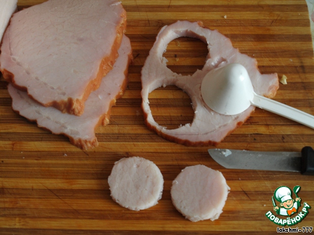 Балык режем кусочками толщиной около 0.5 см. С помощью шаблона (у меня эту роль успешно выполнила чудом сохранившаяся ложечка из-под детского питания) вырезаем кружочки - заготовки для будущих колокольчиков-звоночков.