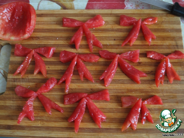 Из помидоров удаляем сердцевины и вырезаем ленточки для звоночков.