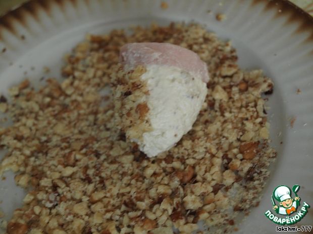 На кружочки из балыка кладем немного смеси из брынзы, придаём нужную нам форму и обваливаем в измельчённых грецких орехах.