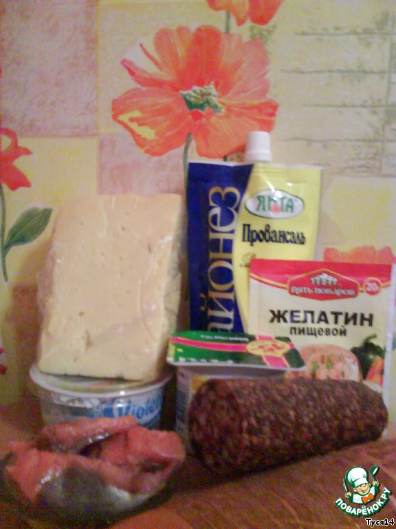 Тщательно взбиваем два вида сыра, майонез и йогурт. Посолить и поперчить по вкусу. Продолжая взбивать, тоненькой струйкой вливаем распущенный желатин.