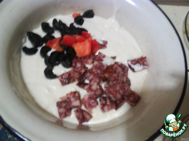 Для начинки я использовала оливки, сервелат, перец красный, слабосоленую рыбку.