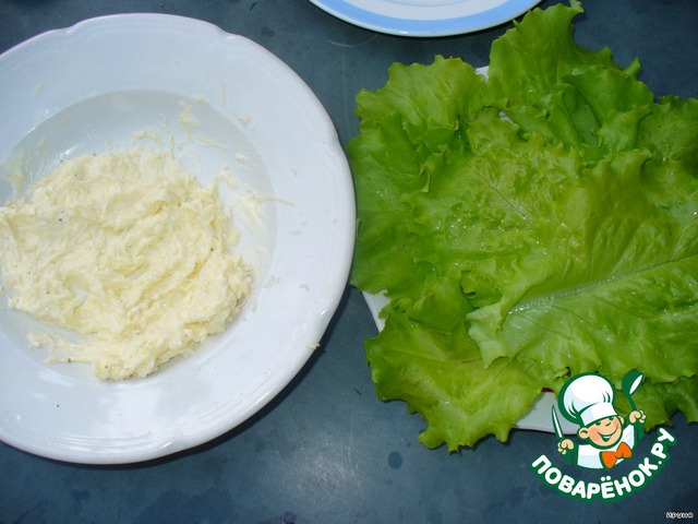 На листья салата выкладывать начинку и сворачивать рулетиками.