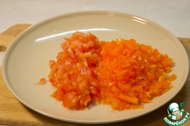 Мелко нарезать перец и помидор.