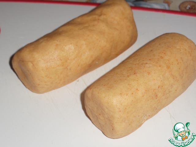 Разделить на 2 колобка, сформировать колбаски 5 см диаметре, завернуть в пленку и на 30 минут убрать в холодильник.