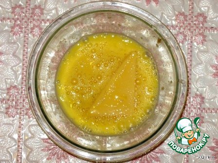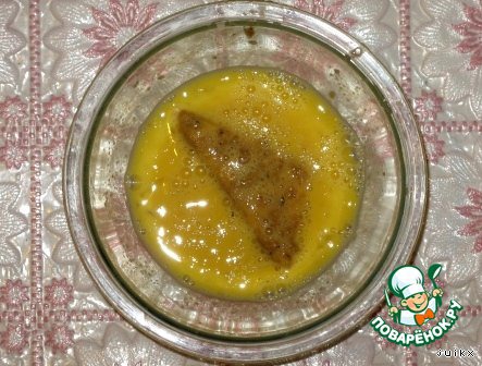 Взбить яйцо и обмакнуть в него сыр, нарезанный толщиной в 2 см и формой, какая Вам по душе. У меня это косыночки.