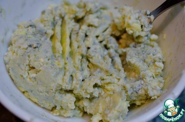 Далее выложить слой сырной массы из сыра с плесенью, равномерно распределить.