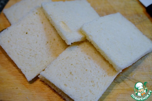 С кусочков хлеба срезать корочку и обрезать под размер формы. Форму застелить фольгой.