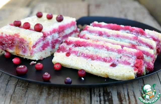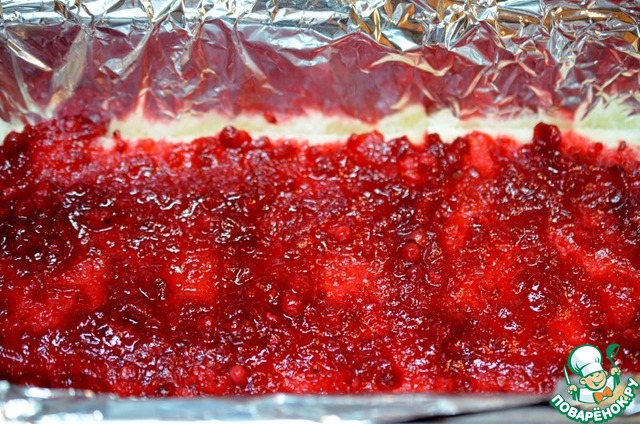 Выложить первый слой из 2-х кусочков хлеба, на него выложить 2 ст. л. брусничного варенья.