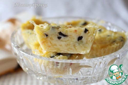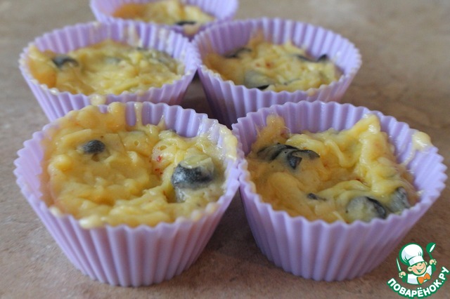 Добавить натертый сыр с маслинами, муку и разрыхлитель, перемешать. Полученную массу выложить в силиконовые формочки (у меня получилось 5 штук). Выпекать в микроволновке 3 минуты при 800 Вт.