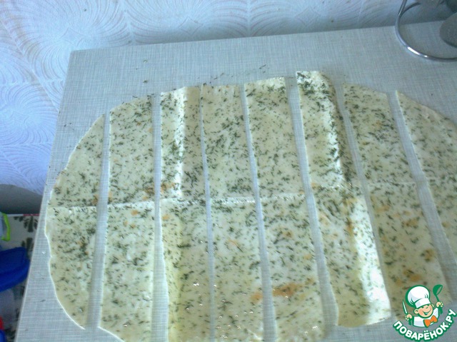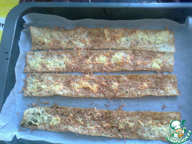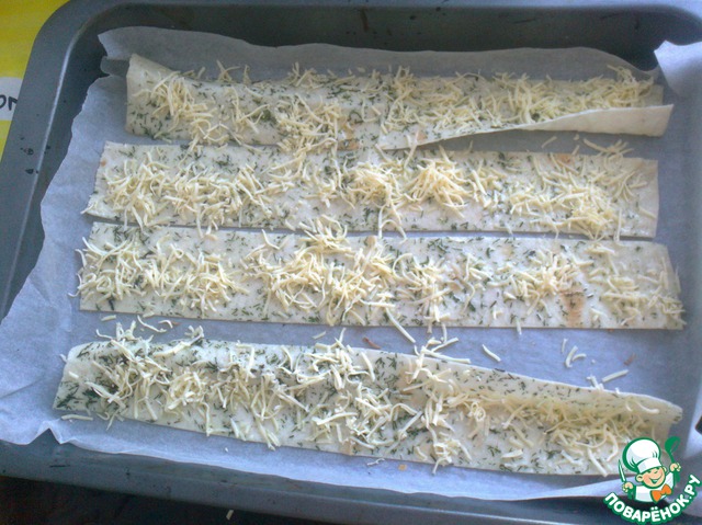 Перекладываем на противень, застеленный пергаментной бумагой. Посыпаем сыром.
