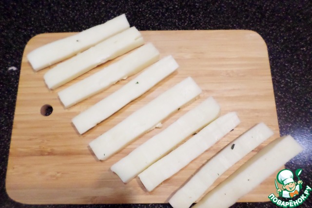 Первым делом порежем наш сыр порционными брусочками. И сразу же поставим на огонь сковороду с маслом