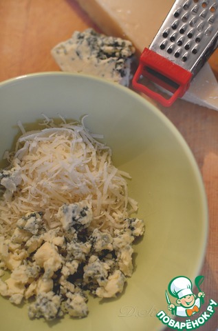 В миске соедините пармезан и раскрошенный голубой сыр.