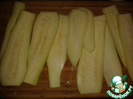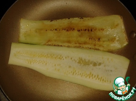 Кабачок кладём намасленной стороной на сковородку и обжариваем. Тут возможно возникновение проблемы несовместимости размера сковороды с длиной кабачка. Всё, что сковороды не касается, можно просто прижать пальцами для равномерного прожаривания. Далее прямо на сковороде мажем второй кабачковый бок и переворачиваем. Жарим на второй стороне. Готовые складываем на широкое блюдо и присаливаем.