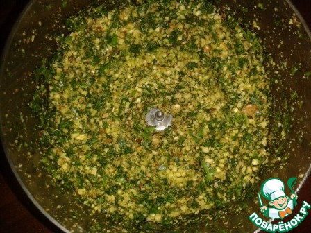 Для соуса, который можно использовать и в безкабачковой диете (просто мазать на тосты или на варёную картошку и пр.) смалываем в комбайне или мелко режем зелень (у меня мнооого петрушки и немного укропа) и орехи (грецкие, можно не грецкие, можно и без орехов). Выдавливаем чеснокодавкой (да, я не люблю резать много-долго, а всё оптом давлю и от этого у нас с мужем холивар и семейные разногласия) несколько зубчиков чеснока. Добавляем для связки жирную сметану или не жирную или не сметану, а йогурт не сладкий или даже, божечки, майонез вредный, но вкусный. Перемешиваем. Смесь должна мазаться. Если будет много жидкого ингредиента (майонеза не касается), то соус будет течь и кабачки через полчаса будут лежать в молочной жиже.