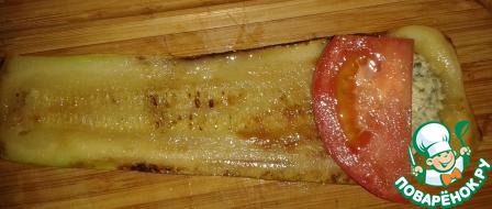 Помидорку режем на дольки. Можно и без помидорки. Кабачок мажем соусом. Я не устраиваю СПА-обёртывания на всё кабачковое тело, а просто кладу кусок соуса на одну сторону (скорость мне важна на кухне), кладём помидорку (или не кладём) и сворачиваем рулетиком или не рулетиком.