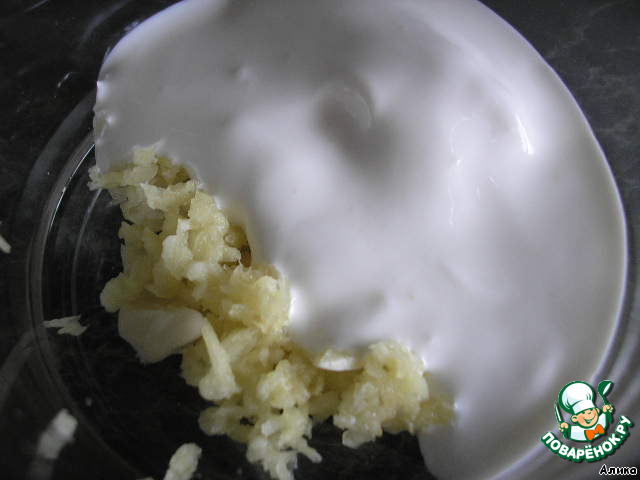 Выложить в чашку сметану и чеснок, пропущенный через пресс.